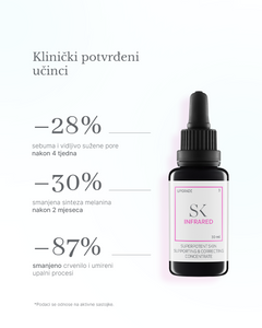 Proizvod je pogodan i posebno preporučljiv kod dermatoza poput rozaceje i akni koje prati narušena hidrolipidna barijera kože te se uslijed tog disbalansa javljaju simptomi upale poput ljuskanja epiderme, svrbeža, crvenila i upalnih procesa. Infrared je formuliran bez dodatka parabena, mirisa, alkohola, sintetskih bojila i drugih iritansa, te se nalazi u staklenoj bočici na kapaljku.